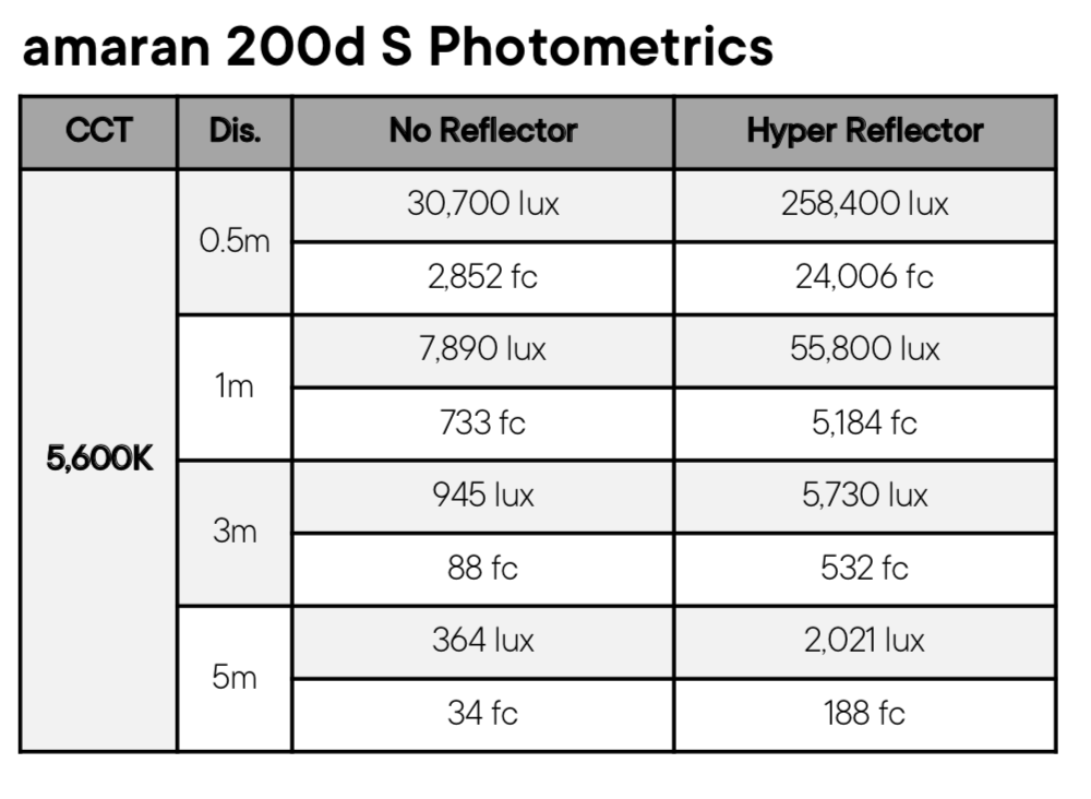 Model 200d S zawiera potężną diodę LED, która w połączeniu z reflektorem Hyper Reflector może emitować ponad 55 800 luksów w odległości 1 metra. Jego prosta i kompaktowa obudowa zawiera intuicyjny ekran LCD i pokrętło sterujące, który płynnie wtapia się w korpus lampy, z możliwością regulacji światła w krokach co 1%.