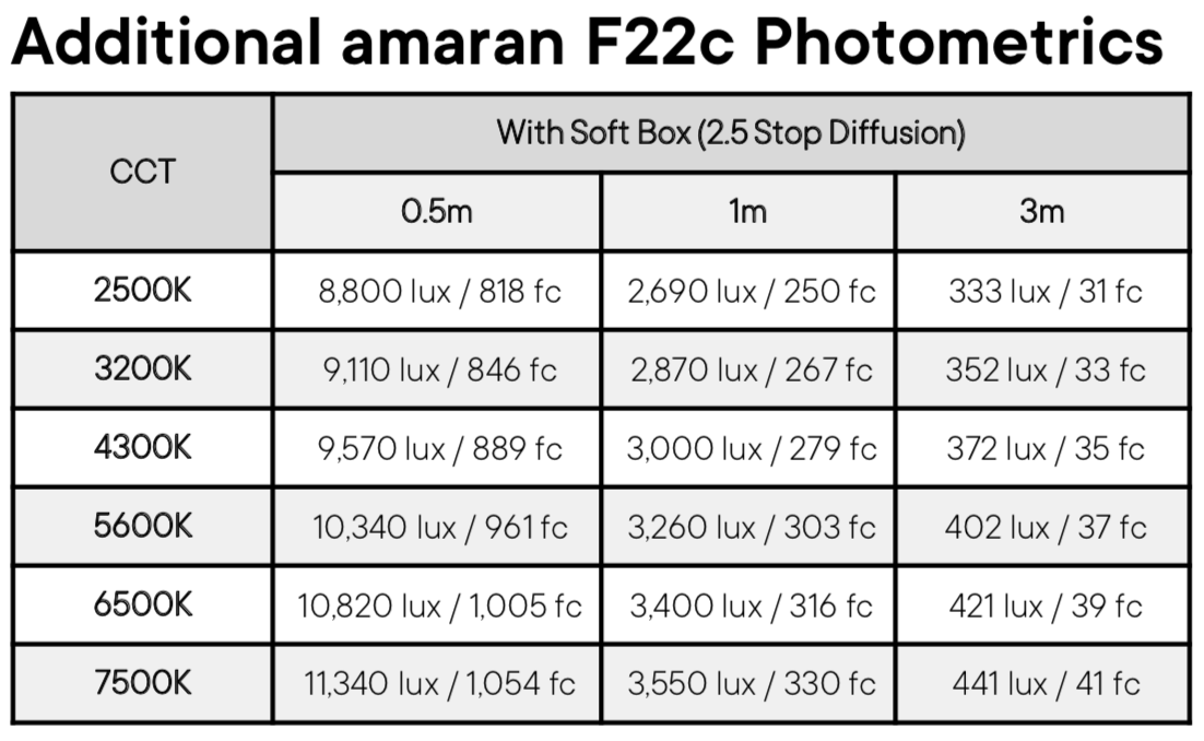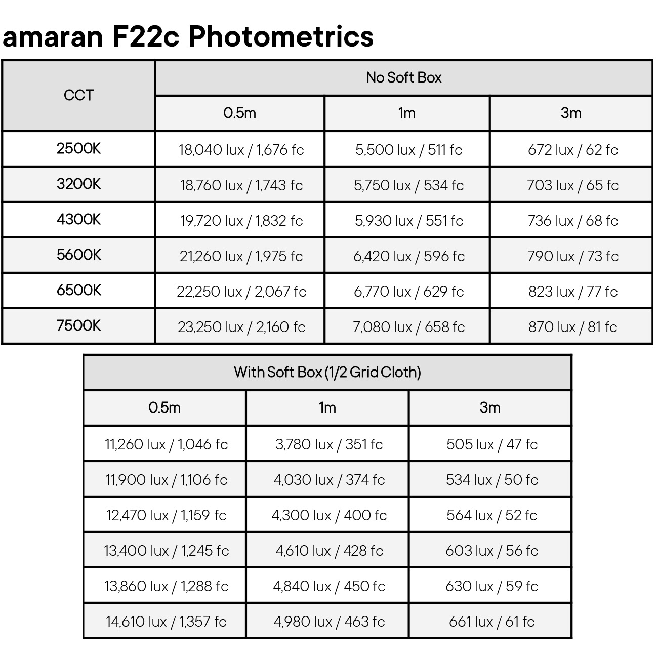 Mata F22c jest wyposażona w diody LED RGBWW zapewniające pełną kontrolę kolorów, a także przestrajalną temperaturę CCT od 2500 K do 7500 K, zapewniając nieograniczone możliwości kreatywnego podejmowania decyzji oświetleniowych poprzez sterowanie HSI 360°, 46 gotowych ustawień folii efektowych, a nawet 15 unikalnych efektów świetlnych (paparazzi, błyskawica, telewizor, świeca, ogień, stroboskop, eksplozja, uszkodzona żarówka, pulsowanie, spawanie, samochód policyjny, color chase itp.).